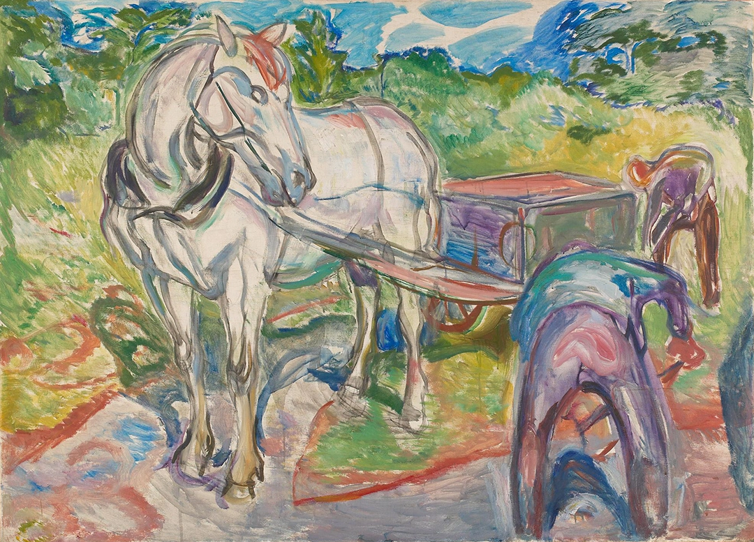 Like every authentic craftsman, Munch respected work above all else. Forestry, harvesting, tilling the land. In Digging Men with Horse and Cart (1920), the men bend over their shovels while a white horse between the shafts resembles an almost transparent garland of muscle and taut energy. The horse—possibly modeled after Rousseau, Edvard’s own—nods toward the men who dig, invested with a gesture of near-ritual blessing.