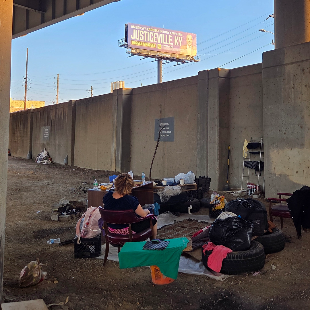 At the foot of a wall that separates the avenue from the shore, beneath the highway bridge, someone lives. The person was absent when we arrived, which allowed me to observe the space in detail. What struck me was that amid the disorder there emerged everywhere aesthetic gestures, conceptual hints, even philosophical statements. I wonder if the arrangement forced by precariousness holds the same beauty that arises from the universal conditions of physics, from the intrinsic properties of matter itself.