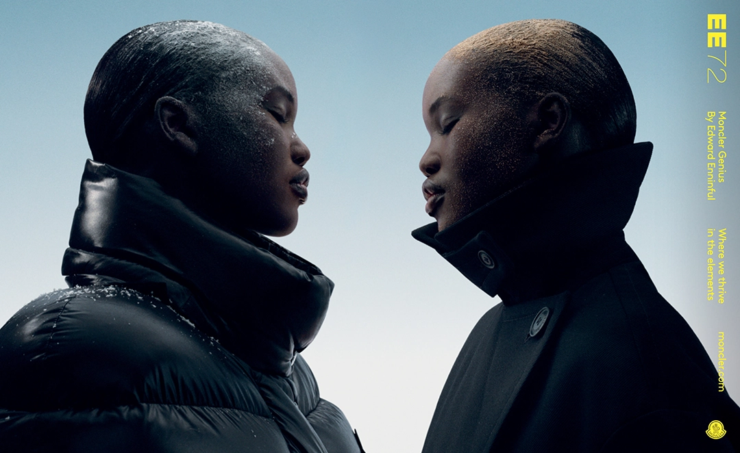 This image belongs to a Moncler Genius campaign, specifically EE72, photographed by Edward Enninful. A winter fashion editorial under the motto Where we thrive in the elements, it appeared in Harper’s Bazaar USA – The Icons Issue this very September 2025.